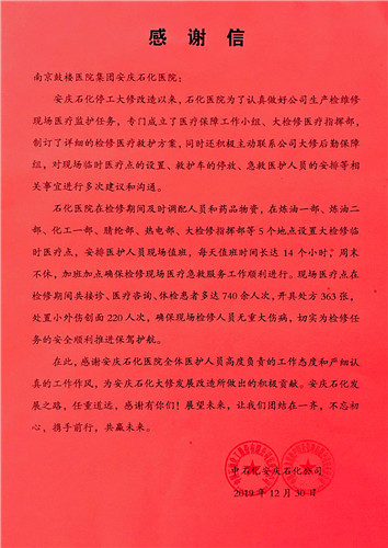 中石化安慶分公司2019年度大檢修順利收官,分公司領(lǐng)導(dǎo)到我院頒送感謝信,稱“石化醫(yī)院白衣天使是檢修現(xiàn)場(chǎng)一道靚麗的風(fēng)景線?!?/span>