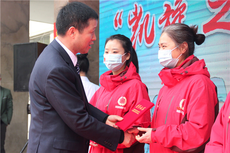 陳書記宣讀醫(yī)院嘉獎令,周院長為隊員們頒發(fā)“白衣勇士”獎杯。