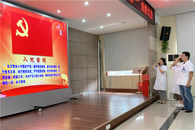 新黨員方小龍、徐小雯在鮮紅的黨旗下莊嚴(yán)宣誓,為共產(chǎn)主義奮斗終身,全體老黨員也一同重溫入黨誓詞。