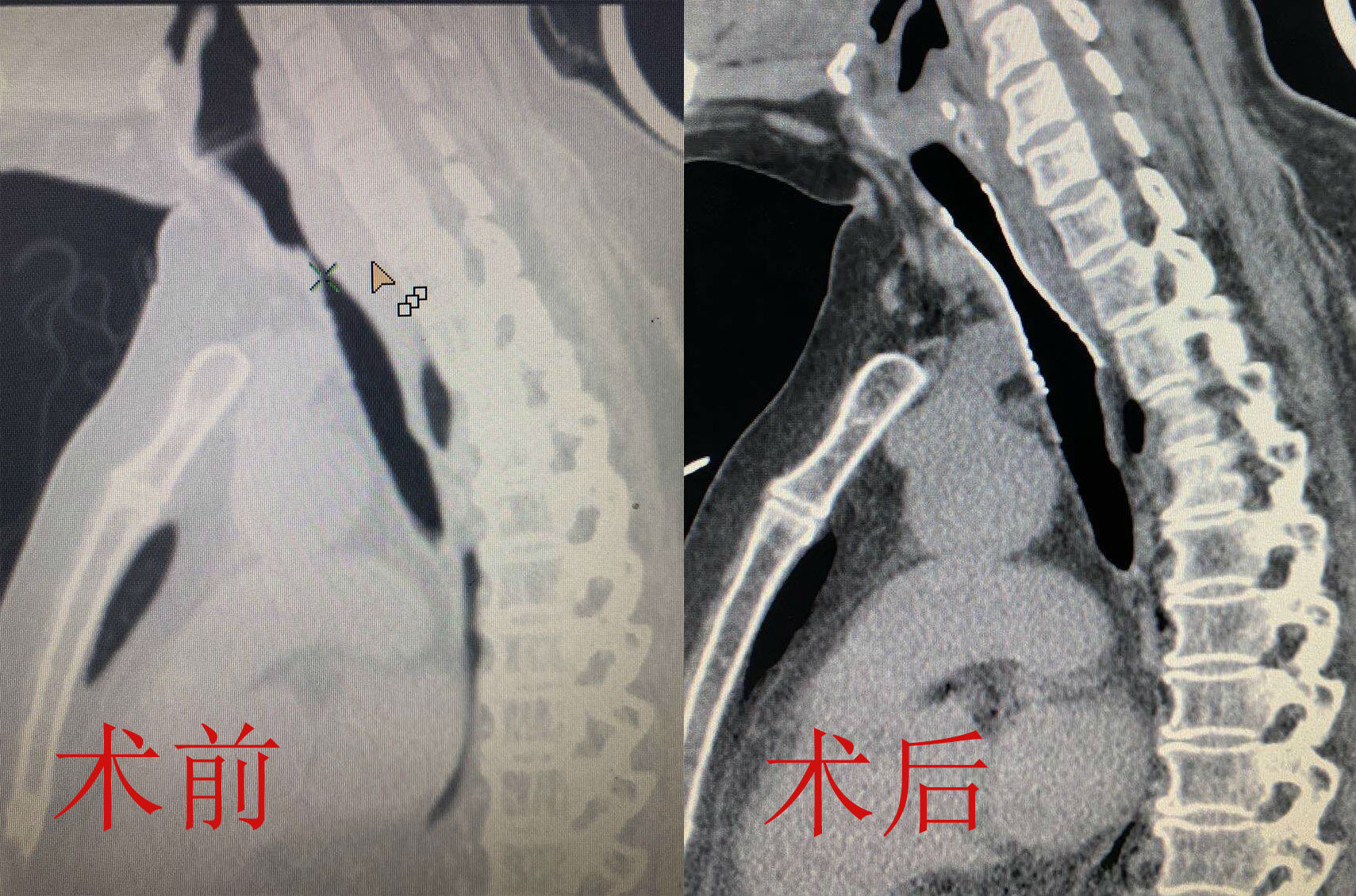 支架植入時(shí),患者的氣管會(huì)被臨時(shí)堵塞,如何冷靜、準(zhǔn)確地在短時(shí)間內(nèi)快速釋放支架,為患者撐起一線生機(jī),術(shù)者的技術(shù)和經(jīng)驗(yàn)至關(guān)重要。同時(shí),該患者氣管狹窄位置較高,若支架植入過低,則不能發(fā)揮效果;若支架植入過高,術(shù)后咽部刺激感明顯,依然不能提高生活質(zhì)量。因此,精確定位支架也是此次手術(shù)的一大難點(diǎn)。