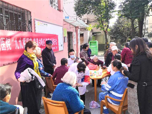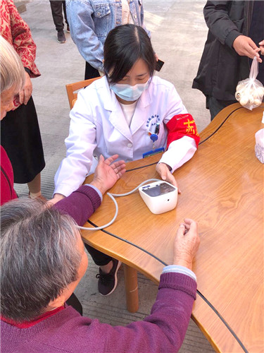 來自臨床醫(yī)技科室的團(tuán)員們?yōu)槔先肆垦獕?、測血糖,耐心答疑解惑,指導(dǎo)保健方法和注意事項(xiàng),叮囑老人們保重身體,定期體檢。