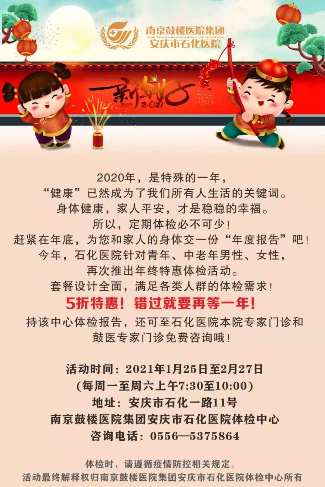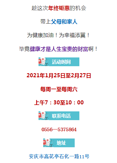 特殊的2020年已經(jīng)過去大家辛苦了一年也擔(dān)心了一年為了我們所有人的健康南京鼓樓醫(yī)院集團(tuán)安慶市石化醫(yī)院再次推出年終體檢套餐優(yōu)惠活動(dòng)請(qǐng)攜帶上你們的親人來參加