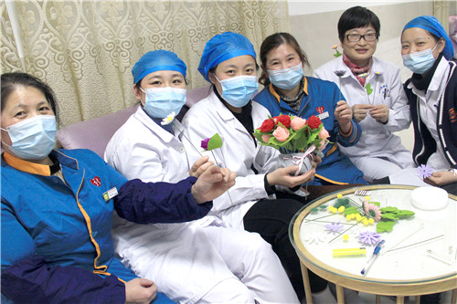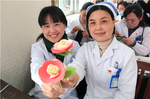 醫(yī)院近150名女職工歡聚在一起,放松心情,默契合作。愜意談笑間,創(chuàng)造出一片五彩繽紛的花海!拈花淺笑著,快樂的心花兒亦朵朵綻放!