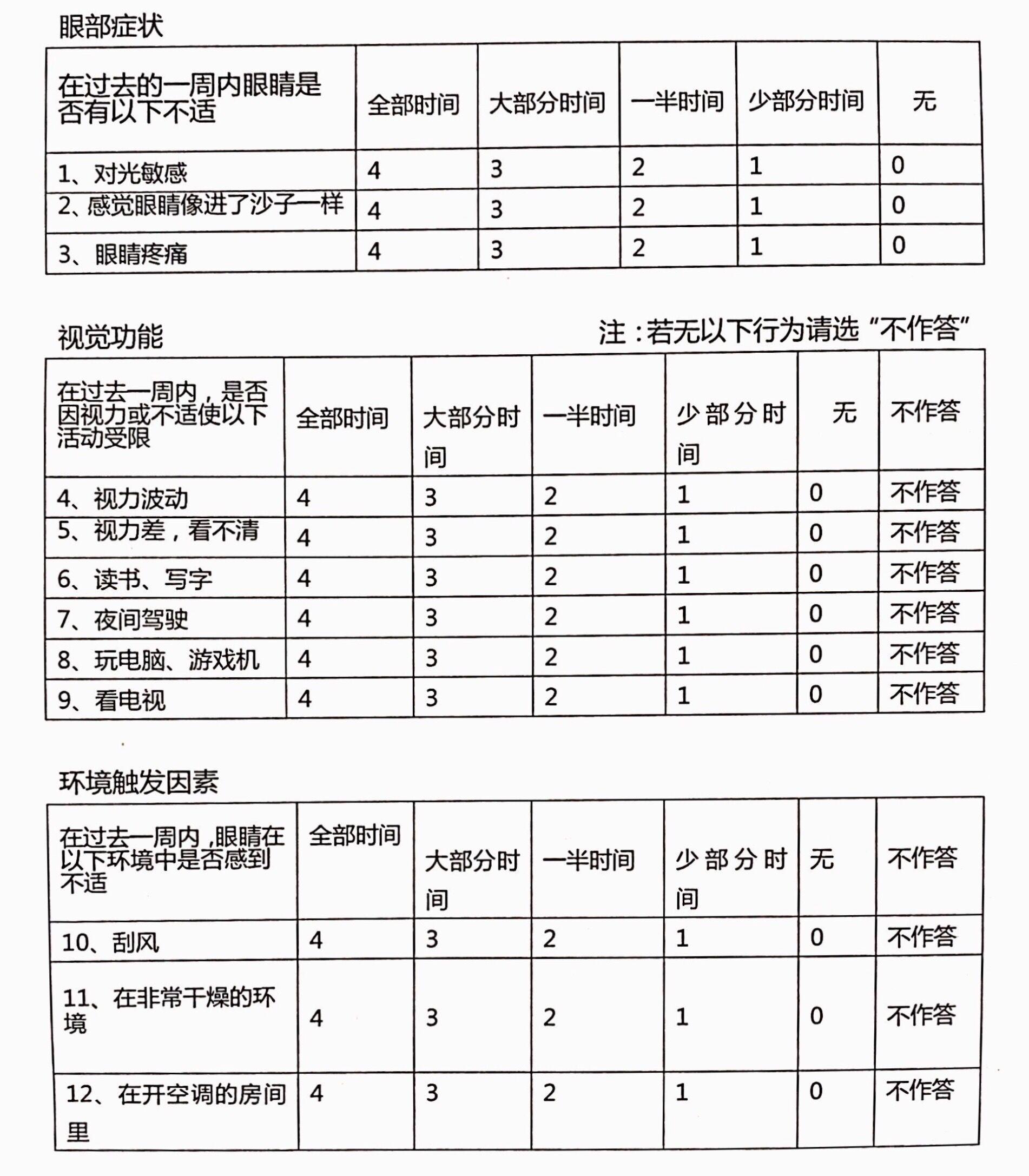 評分=25×得分總和所回答問題總數(shù):評分≤20,為輕度癥狀;21≤評分≤45,為中度癥狀;46≤評分,為重度癥狀。