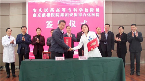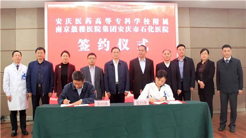 在各級領(lǐng)導(dǎo)的共同見證下,南京鼓樓醫(yī)院集團(tuán)安慶市石化醫(yī)院院長韋寧華和安慶醫(yī)藥高等??茖W(xué)校校長姚文兵現(xiàn)場簽訂合作協(xié)議。