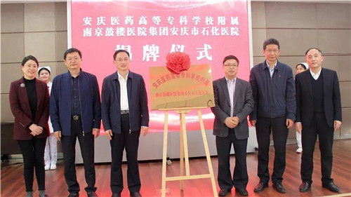 郭家滿副市長、姚文兵校長、于成功副院長、陳亞軍總裁、潘結(jié)標(biāo)主任、余巧萍局長共同為安慶醫(yī)藥高等??茖W(xué)校附屬南京鼓樓醫(yī)院集團(tuán)安慶市石化醫(yī)院揭牌,標(biāo)志著雙方院校合作開啟新篇章。