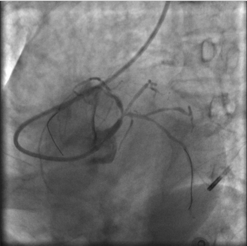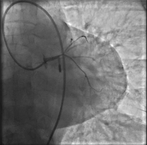 小心操作導絲及導管,艱難到達主動脈根部,但導管難以“到位”左冠口,“冒煙”見左主干居然完全閉塞了。