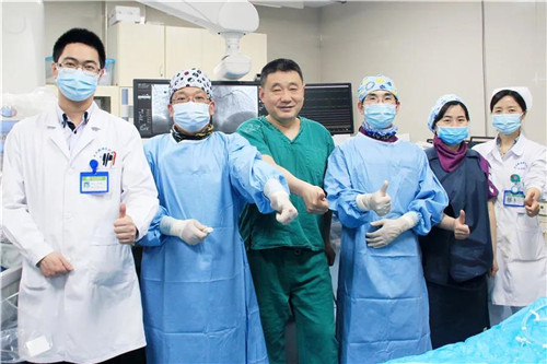 因右側肱動脈狹窄、股動脈一側已植入IABP,徐主任這次選擇了經左側橈動脈入路手術?;颊咧鲃用}弓扭曲,導管操控十分困難,但依然沒有難住有經驗的石醫(yī)心血管人,他們小心翼翼操控導管、導絲到位。