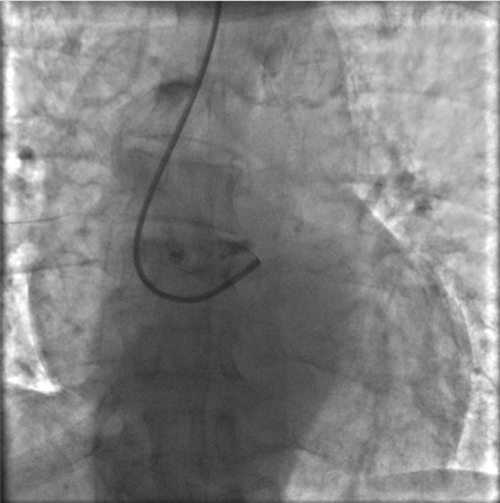 快速完成右側橈動脈穿刺,上造影導管受阻后,行肱動脈造影,發(fā)現右側肱動脈重度狹窄。