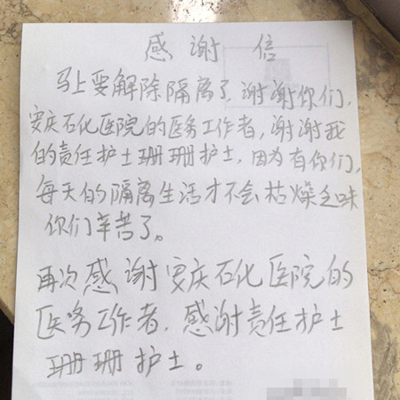 疫情當前,沖鋒一線守護百姓健康是我們醫(yī)護人員的職責,忙碌之余,我們還收到了即將解除隔離人員送來的感謝信,字里行間都是真情,讓人倍感溫暖,這真是我們收到過最好的禮物了!