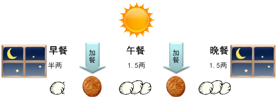 *方法一:由正餐中勻出半兩主食作為加餐食品。
