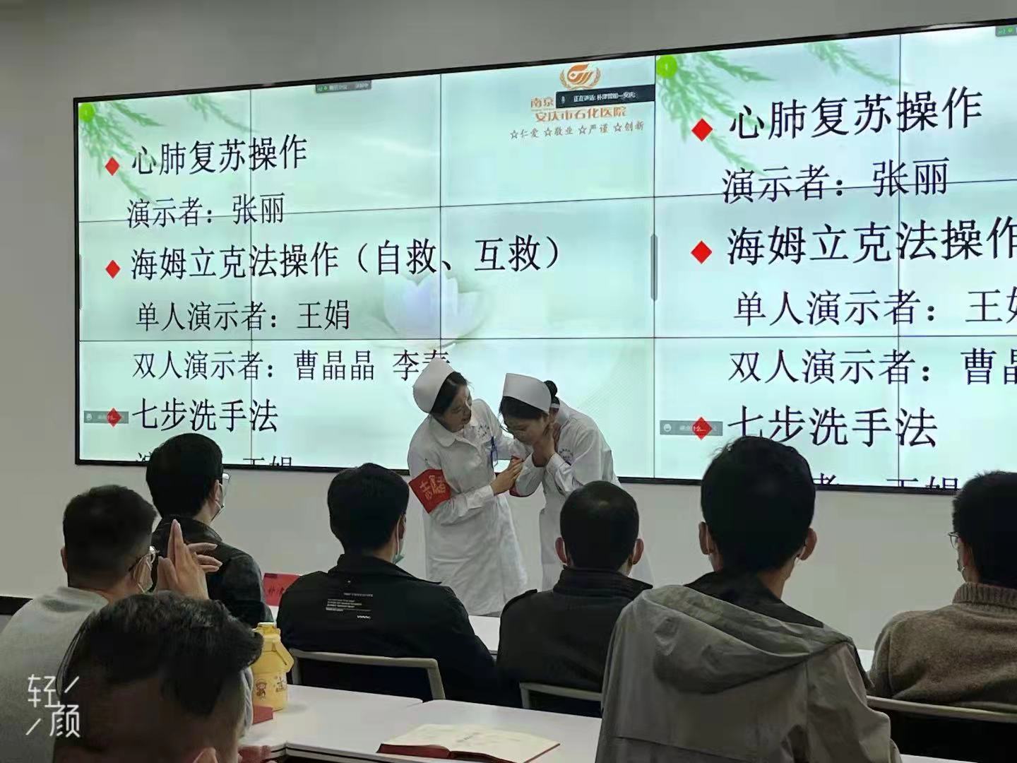 護士王娟進行單人海姆立克法自救演示;護士曹晶晶及李春進行雙人海姆立克法互救演示。
