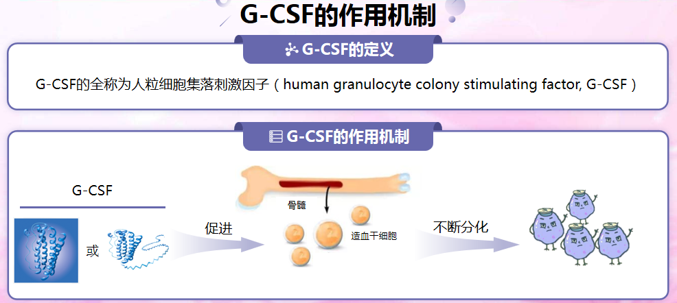 G-CSF分為rhG-CSF(重組人粒細胞刺激因子)和PEG-rhG-CSF(聚乙二醇化重組人粒細胞刺激因子)兩種。