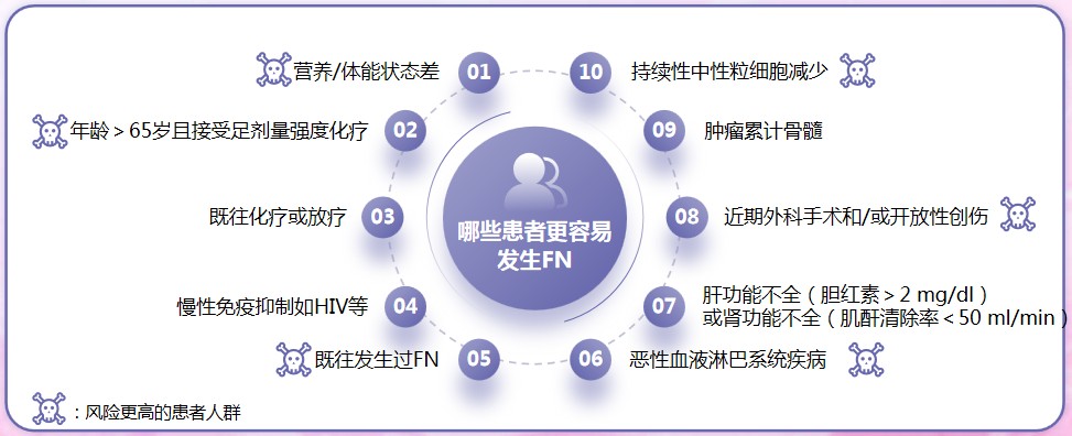 FN風(fēng)險更高的患者人群:營養(yǎng)/體能狀態(tài)差;年齡>65歲且接受足劑量強度化療;既往發(fā)生過FN;患有惡性血液淋巴系統(tǒng)疾病;近期接受外科手術(shù)或有開放性創(chuàng)傷;持續(xù)性中性粒細胞減少。