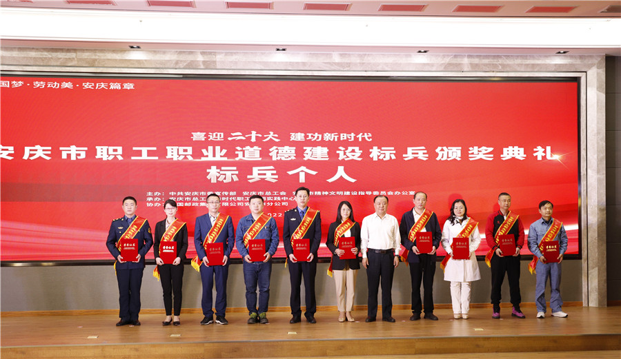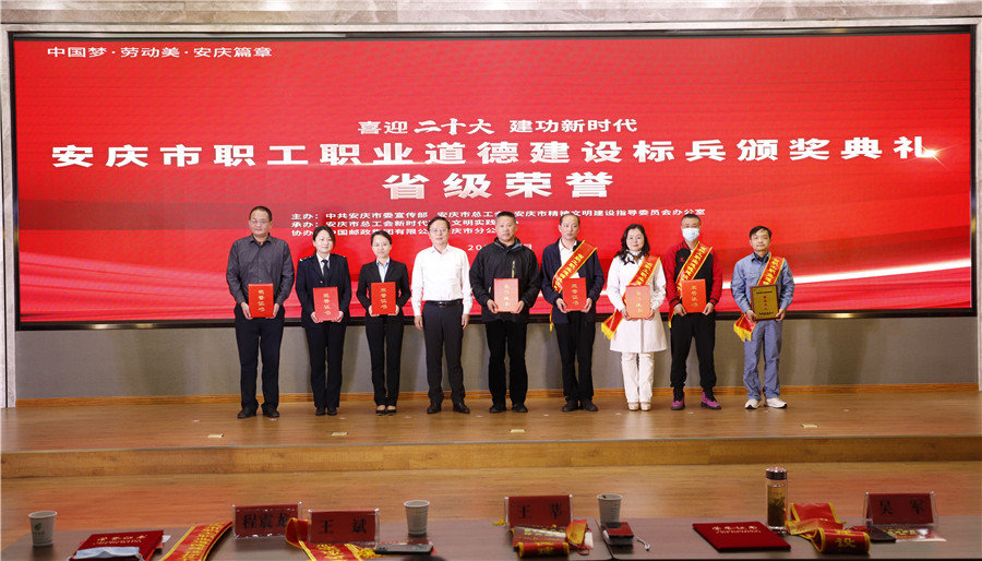 4月21日,在中共安慶市委宣傳部、市總工會(huì)、市文明辦舉辦的安慶市職工職業(yè)道德建設(shè)標(biāo)兵頒獎(jiǎng)典禮上,我院王莘同志同時(shí)獲得安徽省職工職業(yè)道德榮譽(yù)及“安慶市職工職業(yè)道德建設(shè)標(biāo)兵個(gè)人”稱號(hào)。