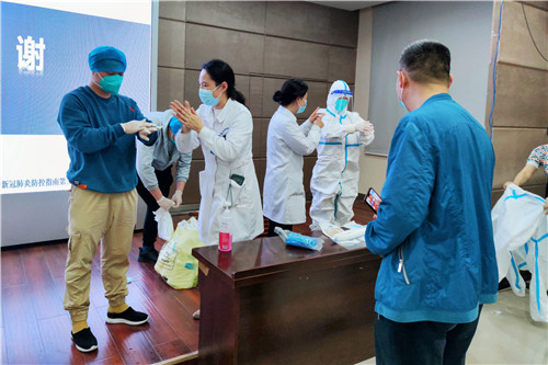 出發(fā)前,院感辦陳麗娟主任及程宏蘭老師為隊(duì)員們?cè)僖淮螐?qiáng)化培訓(xùn),講解注意事項(xiàng),進(jìn)行一對(duì)一指導(dǎo),反復(fù)練習(xí)穿脫防護(hù)服及核酸采樣技術(shù)操作,確保人人過關(guān)。