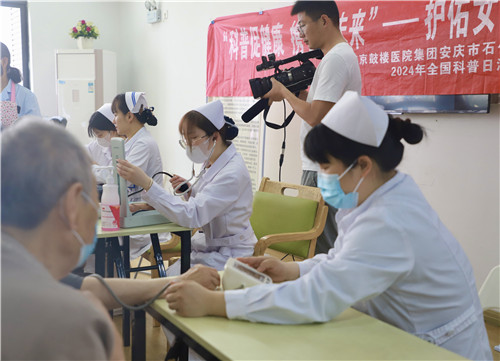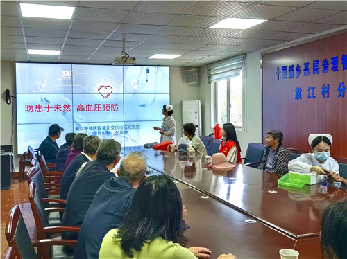 心血管內(nèi)科護(hù)士長彭鳳艷為村里的老人開展《防患于未然高血壓預(yù)防》科普講座,從高血壓的癥狀、危害、防治三個(gè)方面進(jìn)行授課。燒傷整形科護(hù)士董晨晨和教改班學(xué)生為老人提供免費(fèi)血壓、血糖檢測(cè)服務(wù)。