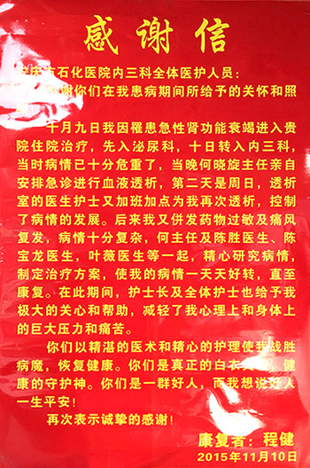 近日,患者向我院腎內(nèi)-老年-風(fēng)濕病科送上一封感謝信,贊揚(yáng)科室醫(yī)護(hù)人員的精湛醫(yī)術(shù)和精心護(hù)理,感謝他們的關(guān)懷和幫助。