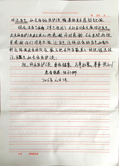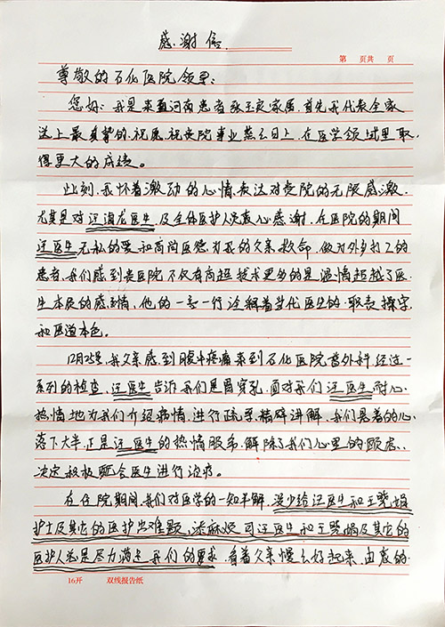 近日,普通外科汪海龍醫(yī)生、王曉娟護(hù)士及科室全體醫(yī)護(hù)獲感謝信一封。信中,病人及家屬表達(dá)感激之情的同時(shí),大力贊揚(yáng)了普通外科醫(yī)護(hù)人員的精湛醫(yī)技和高尚醫(yī)德。