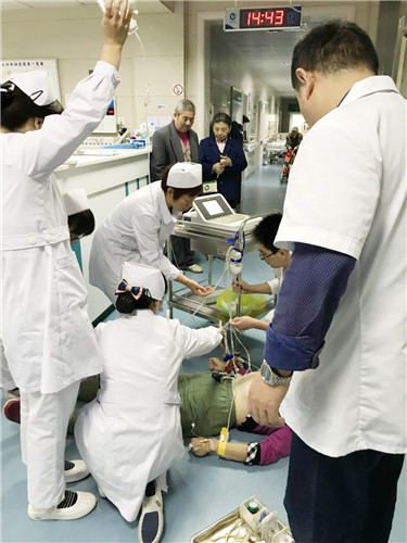 10月11日下午2:40,心內(nèi)科醫(yī)護(hù)都在各自忙碌著。一位老人踉踉蹌蹌走出電梯,剛到科室門口,就身子一軟蹲了下去。值班護(hù)士伍宏愛下意識跑過去詢問,還沒等到回復(fù),就見病人一頭栽倒在地,簡單處理后,馬上為其進(jìn)行心肺復(fù)蘇??剖覉F(tuán)隊配合默契,第一時間為病人建立靜脈通道,通知醫(yī)生,準(zhǔn)備搶救用品;科主任汪念東在現(xiàn)場指導(dǎo),主治醫(yī)師程恭敏立即行心電圖檢查。經(jīng)過大家的共同努力,約60秒后,患者微微睜開眼睛。全體醫(yī)護(hù)稍微松了口氣,卻仍沒有放松警惕,一刻不敢懈怠。簡單的交流后,在確定病人好轉(zhuǎn)的前提下,將其送進(jìn)CCU病房進(jìn)行進(jìn)一步的生命支持,為患者的后續(xù)治療贏得了寶貴的時間。隨后,科主任汪念東召集科室團(tuán)隊,針對病人的病情制定了相應(yīng)的診療方案。經(jīng)過數(shù)十天的治療,病人情況明顯好轉(zhuǎn),已痊愈出院。