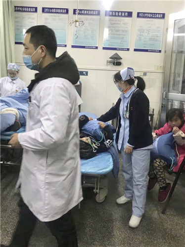 “我們家煤氣中毒了,快來救救我們!”2月6日晚9點,急診科醫(yī)護接120電話,立即帶上急救設(shè)備趕赴現(xiàn)場。兩名女患者已昏迷暈倒在地,三名兒童及一名男士都有不同程度的中毒癥狀。情況緊急,急救人員經(jīng)驗豐富,打開門窗,將患者移至空氣流通處,給予吸氧等救治措施后立即開始轉(zhuǎn)運。人數(shù)多,病情重,在沒有外援的情況下,大家齊心協(xié)力,醫(yī)生張榮桂和擔(dān)架員一起將一名昏迷女患者抬至救護車上,駕駛員張偉背上另外一名昏迷女患者就往樓下沖,護士石嘉麗抱上孩子也緊隨其后,張偉還細心地將自己的棉襖給孩子穿上,僅僅十分鐘就將患者全部轉(zhuǎn)送至醫(yī)院。