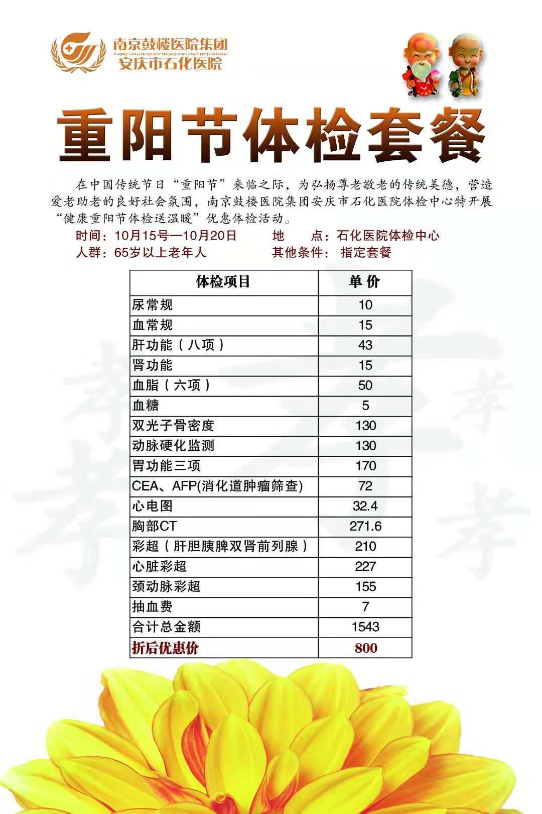 凡65歲以上老人,在10月15日—10月20日期間,到石化醫(yī)院體檢中心,可享指定重陽節(jié)體檢52折優(yōu)惠。