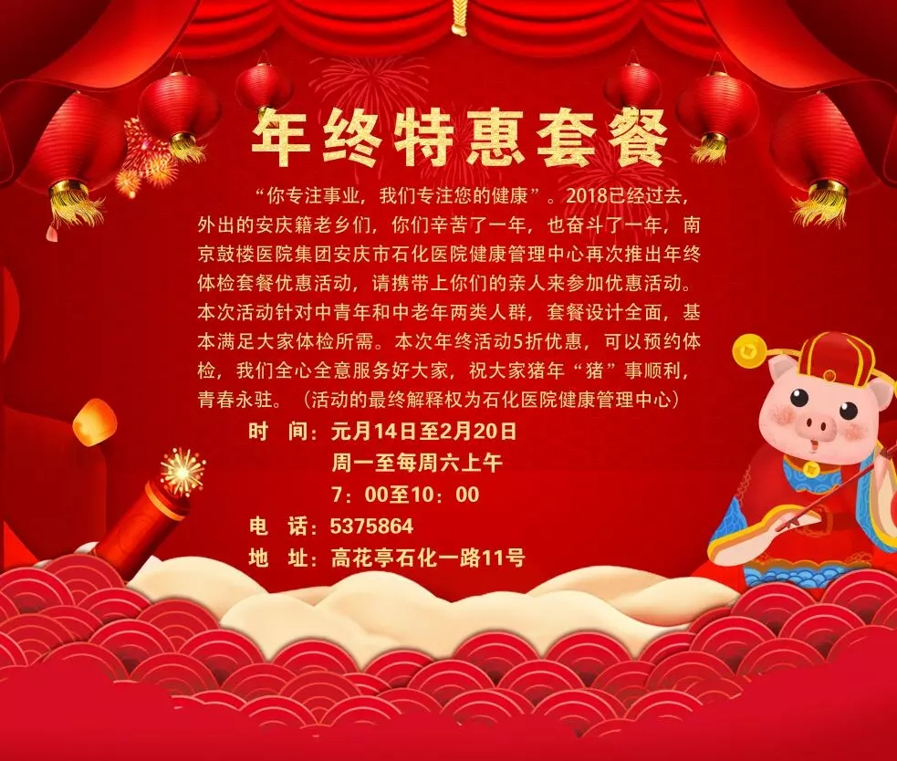 2018已經(jīng)過去,外出的安慶籍老鄉(xiāng)們,你們辛苦了一年,也奮斗了一年,南京鼓樓醫(yī)院集團(tuán)安慶市石化醫(yī)院體檢中心再次推出年終體檢套餐優(yōu)惠活動(dòng),請(qǐng)攜帶上你們的親人來參加!