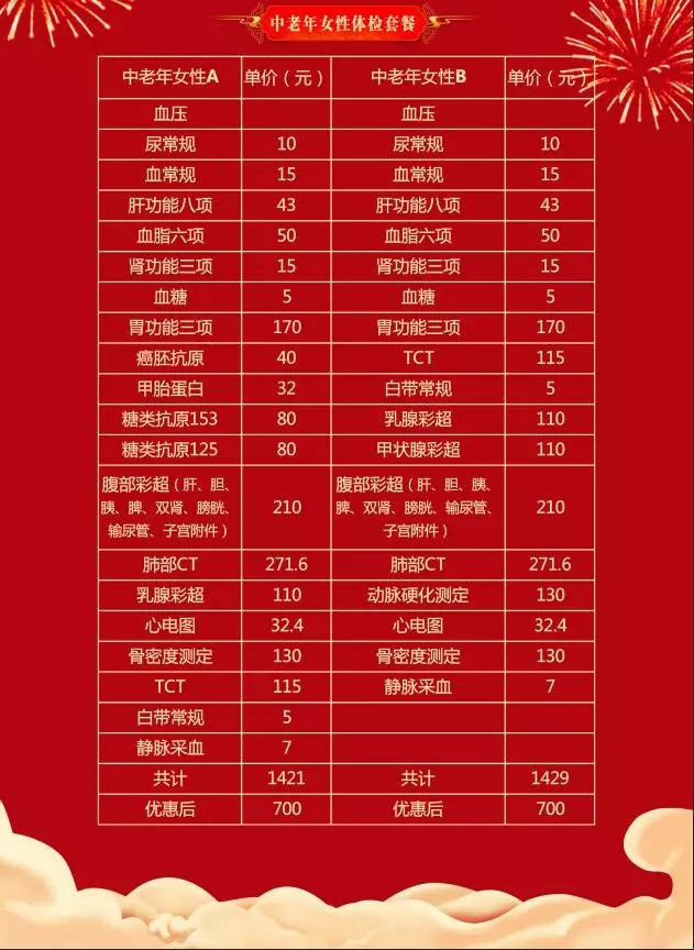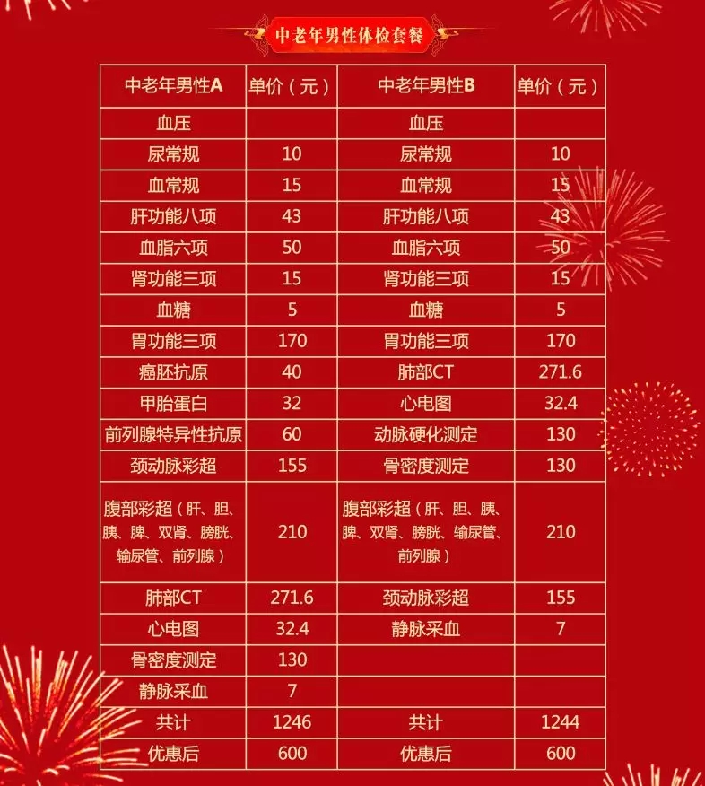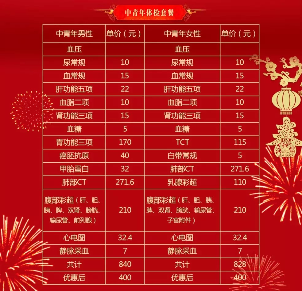 活動(dòng)針對(duì)中青年和中老年兩類人群,套餐設(shè)計(jì)全面,基本滿足大家體檢所需。本次年終活動(dòng)5折優(yōu)惠,可以預(yù)約體檢。