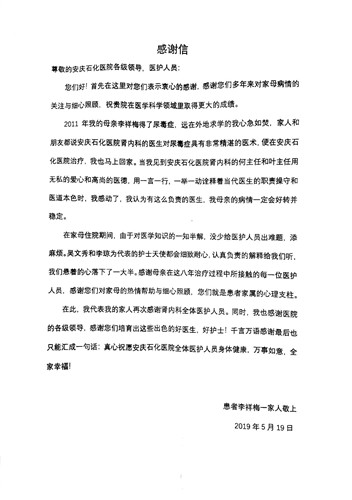 祥梅阿姨是我們的老病號(hào),也是我們的老朋友,長期在我們科住院行透析治療?!拔襾砜纯茨銈?,給你們送錦旗和表揚(yáng)信來啦!謝謝你們一直以來對(duì)我的照顧!”